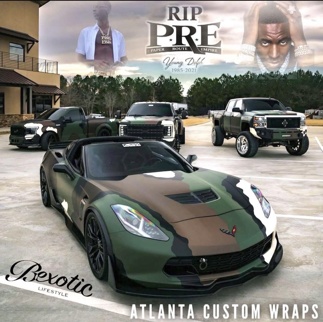 Shout out to Atlanta Custom. According to owner Justin Norton Atlanta Custom Wraps distinct custom camo designs came out of an inquiry it had from a Memphis wrapper named Young. According to owner Justin Norton Atlanta Custom Wraps distinct custom camo designs came out of an inquiry it had from a Memphis wrapper named Young Dolph.